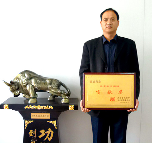 汶川大地震,捐献价值100万药品,职工集资38560元。九月份,被河北省民政厅、慈善总会授予抗震救灾贡献奖。副总王颢捧着这块奖牌非常高兴。